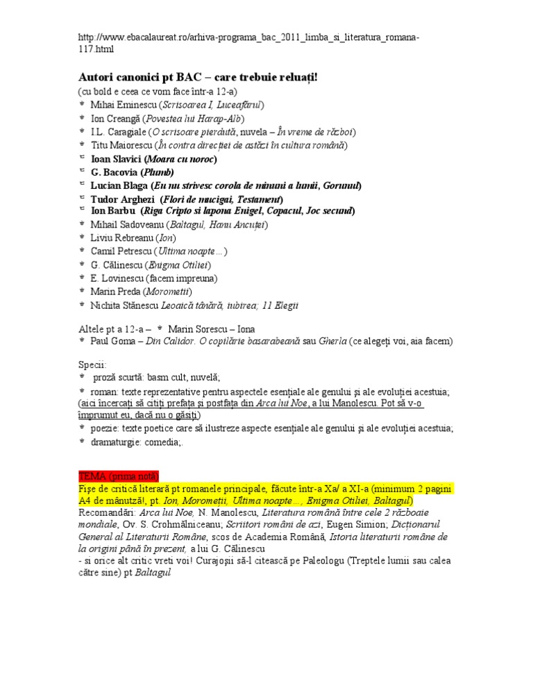 Programa Pentru Bacalaureat 2018 La Limba Romană Profil Umanist