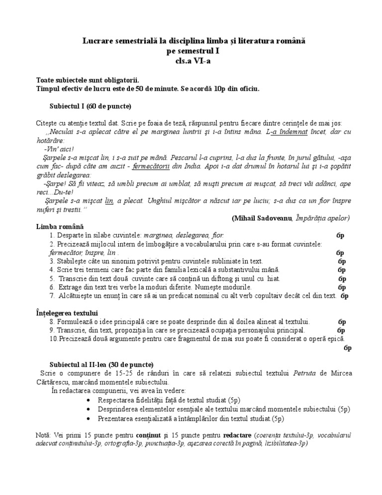 Model De Teza La Limba Romana Clasa 6 Semestrul 1
