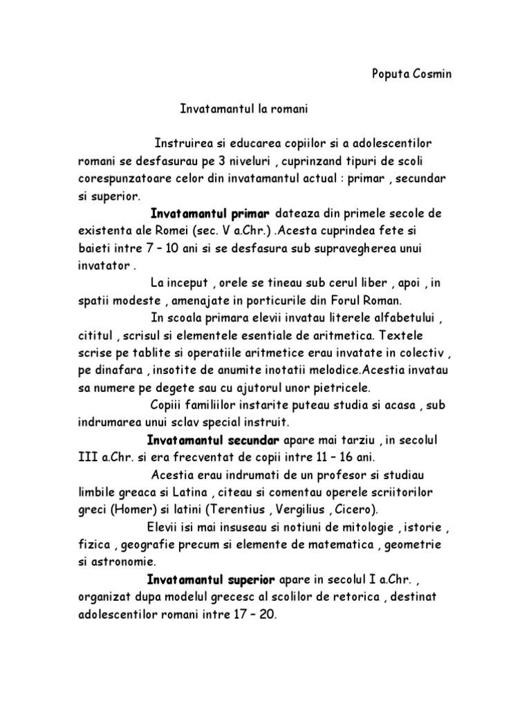 Educaţia In Roma Antică Istorii Regăsite