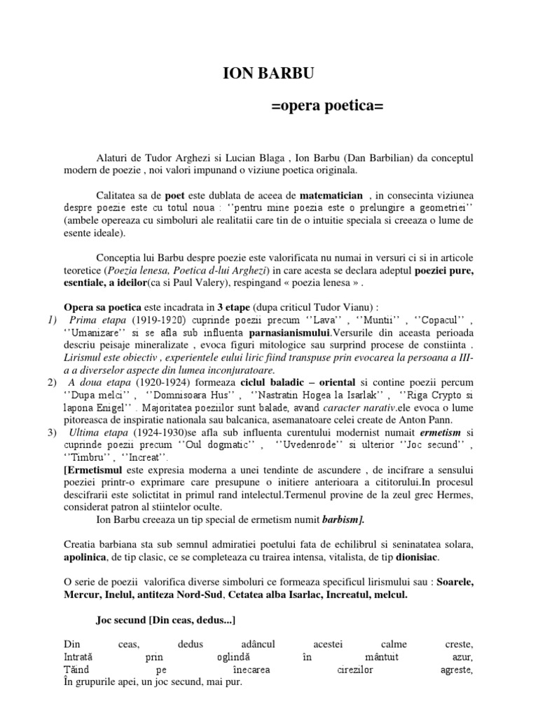 Sinteza Bac Romana Joc Secund De Ion Barbu