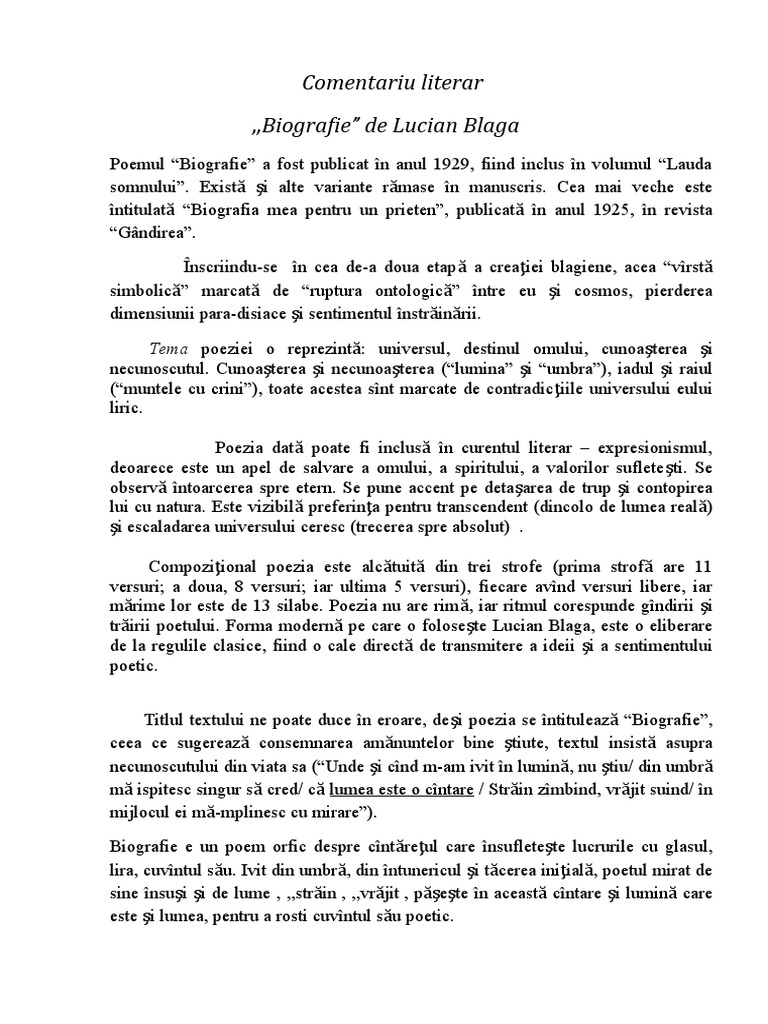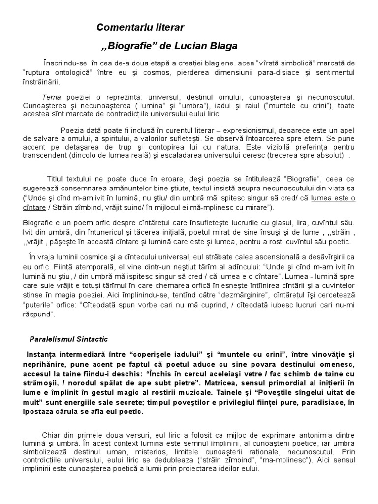 Comentariu Literar L Blaga Biografie