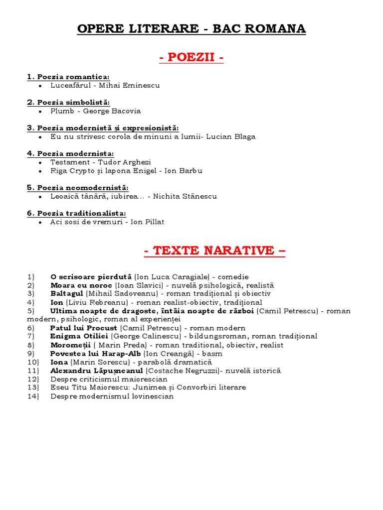 Opere Literare Bac Romana Poezii