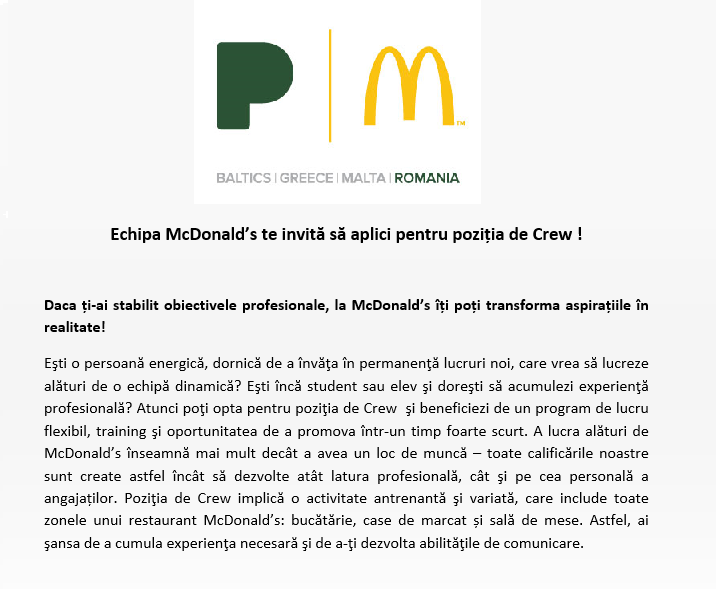 Crew Mcdonald S Premier Restaurants Romania Apply On Ejobs